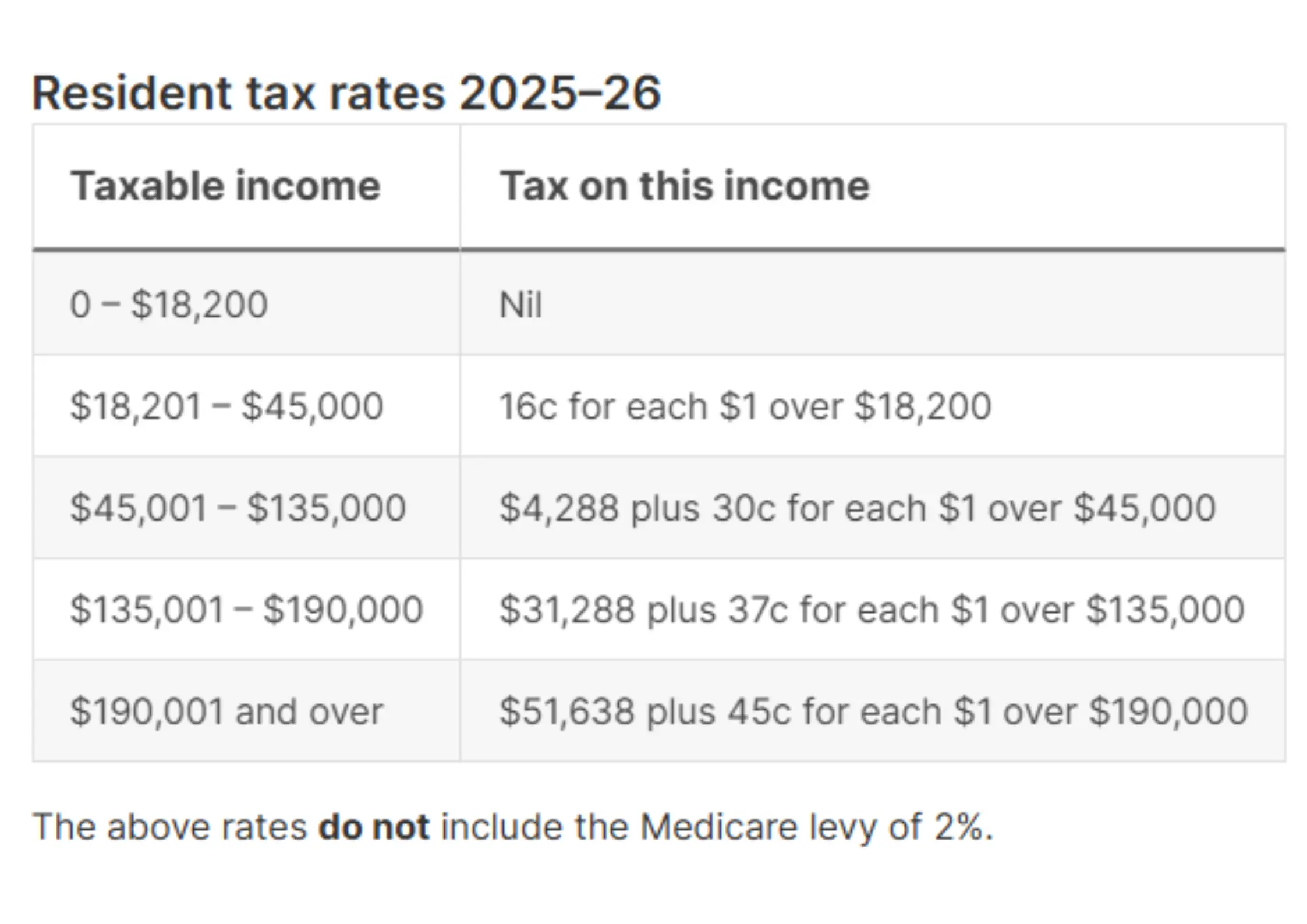 The Individual Tax brackets from 1 July 2025 remain unchanged from the prior Financial Year as follows;